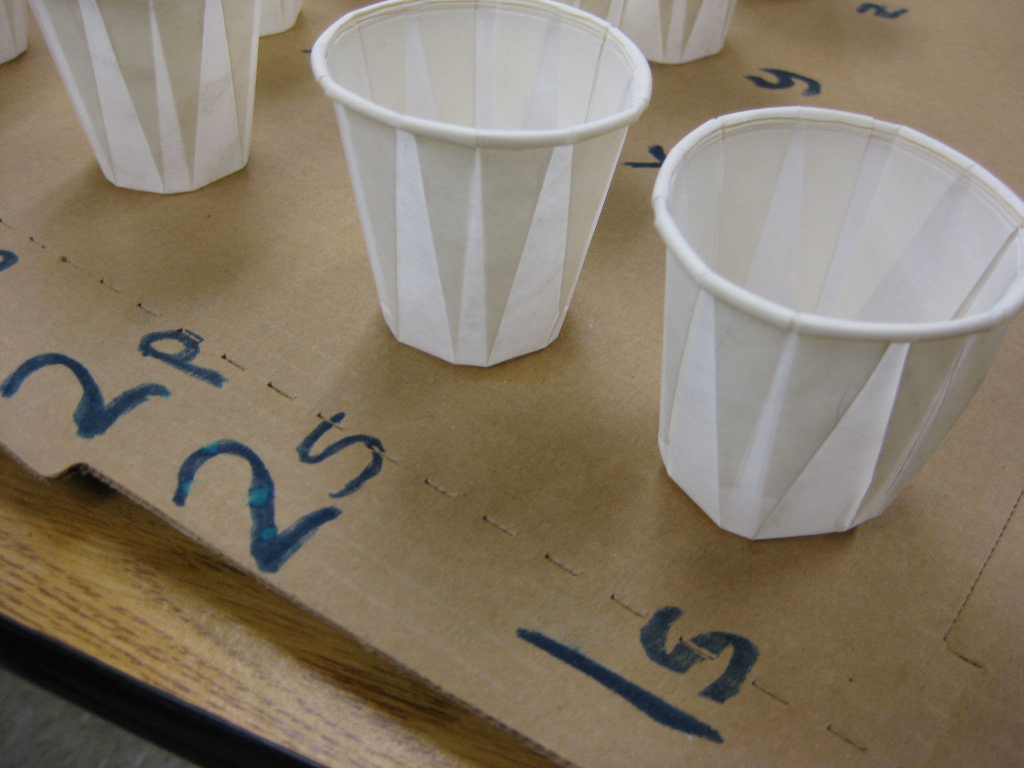 This version utilizes (non-used) pizza boxes with dixie cups (ketchup cups) affixed with white glue or hot glue. We laid the boxes flat and then set the cups onto the surface to get an idea where they needed to go. Then, starting at the bottom, we glued each cup into place one by one until we reached the top of the board. Finally, using a marker, we wrote the notations on the board. Pompons can be used to represent electrons. Other ideas for electrons include buttons of two colors, plastic disks like Tiddlywinks, counters from a math manipulative set, lego or duplo blocks.