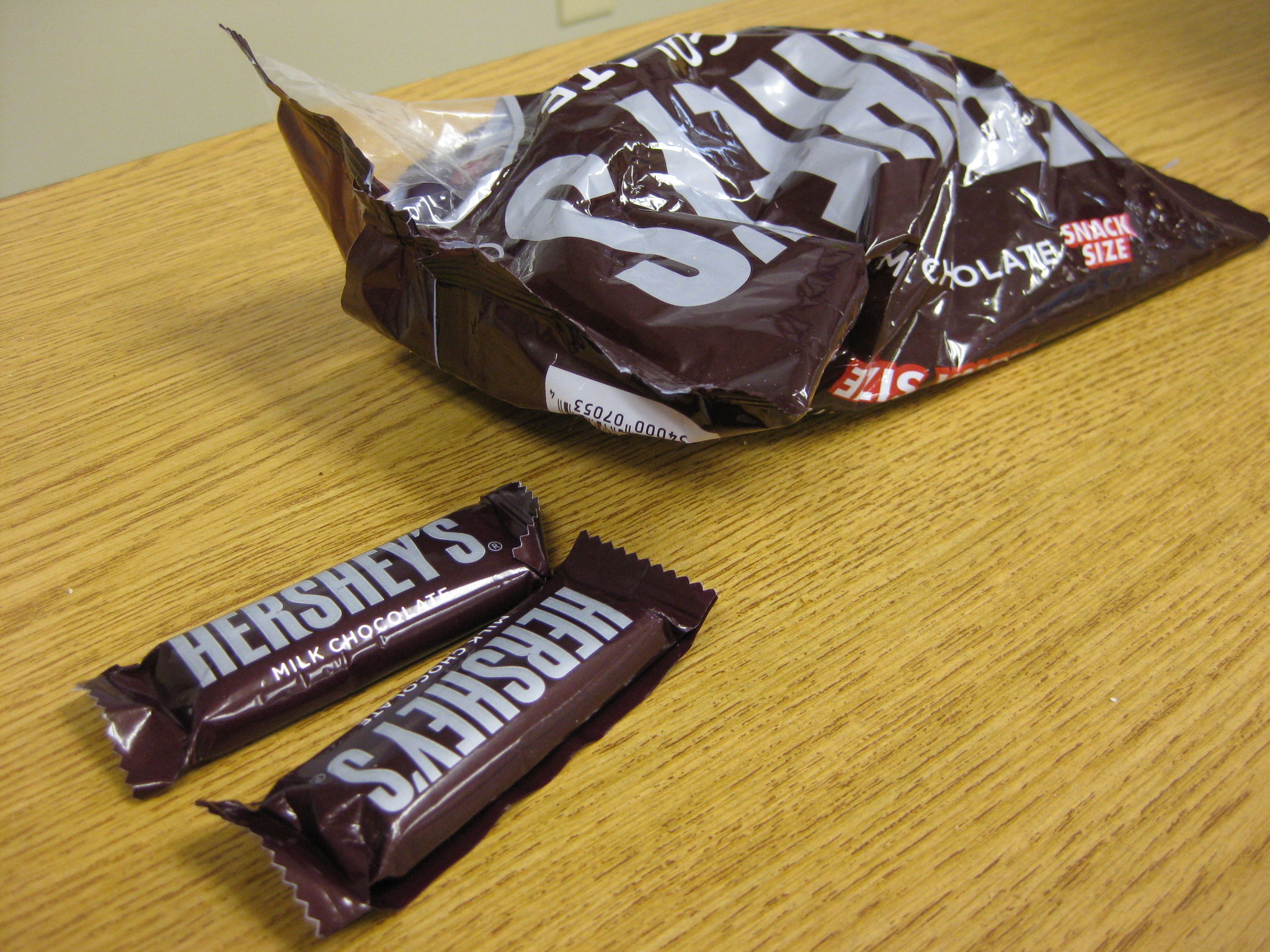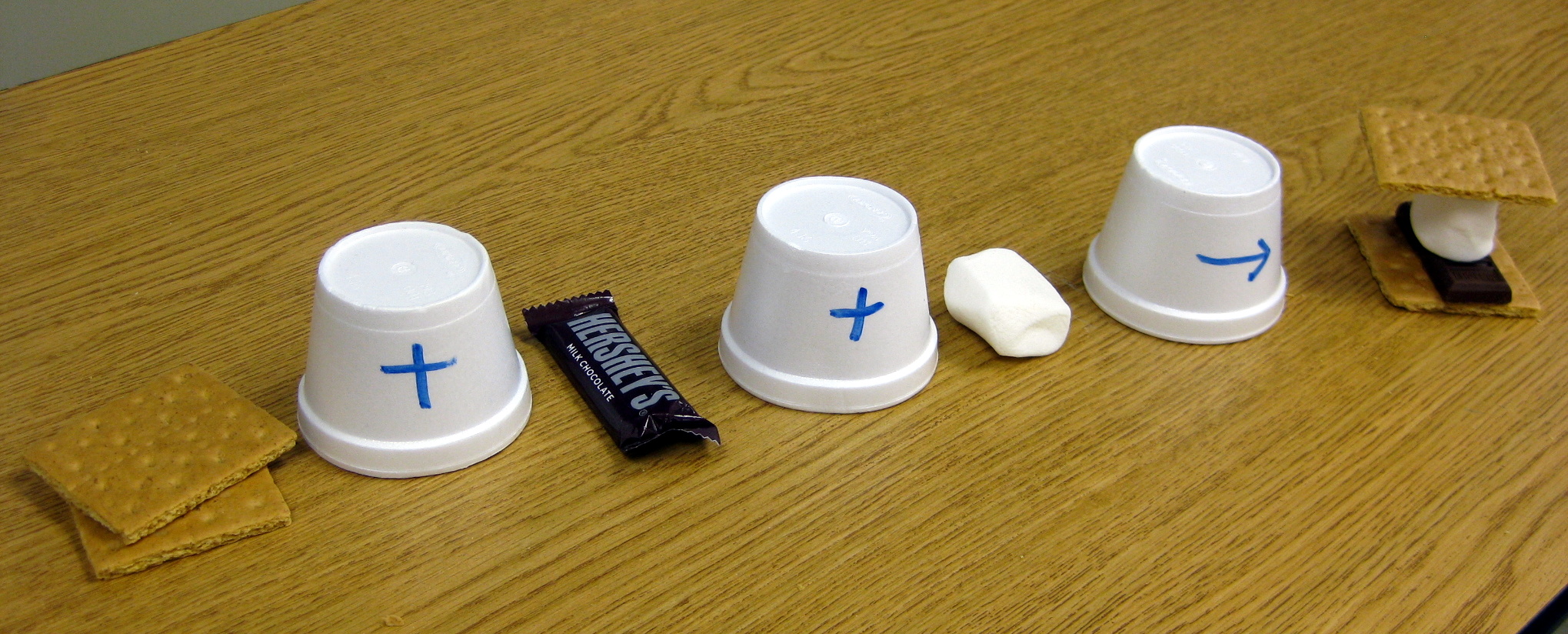 Next, ask them to predict the amount of SMRZ they could produce from two CBs. First, point out the mole ratio (1:1) and state that it takes 1 CB to produce 1 SMRZ. Two CB's should then produce 2 SMRZ. Vary the amount of CBs and ask for the predicted amount of SMRZ. Work through several combinations of reactants and predicted amounts of potential products. Emphasize that in chemistry, instead of using chocolate bars and marshmallows, we'll use chemical compounds! The logic behind the predictions stays the same!